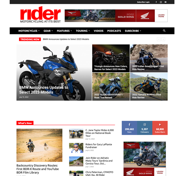 Rider Magazine is a motorcycle publication written by and for enthusiasts. Launched in 1974, for nearly 50 years Rider has been delivered “Motorcycling At Its Best,” including comprehensive road tests, travel stories, product reviews, industry news, practical tech help and compelling features. The Rider team is made up of staff editors, designers, photographers and storytellers from across the U.S. and around the world.
